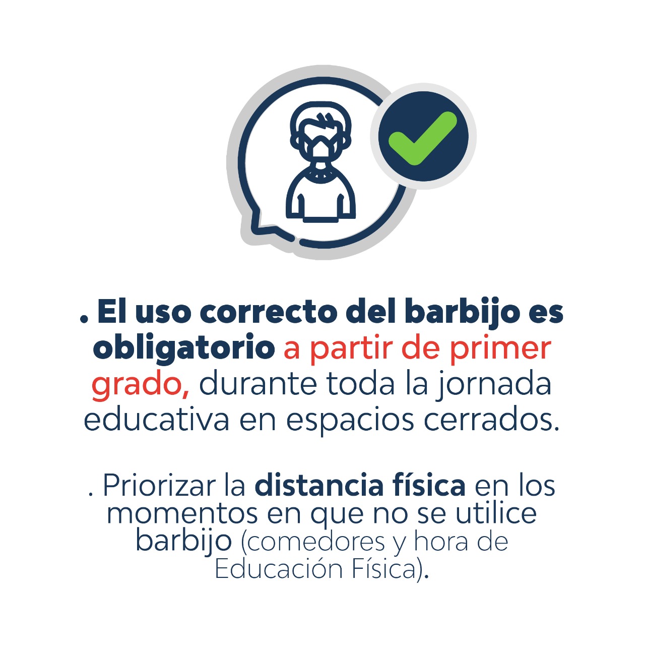 - El uso correcto de barbijo es obligatorio a partir de primer grado, durante toda la jornada educativa en espacios cerrados. (Debe cubrir nariz, boca y mentón).