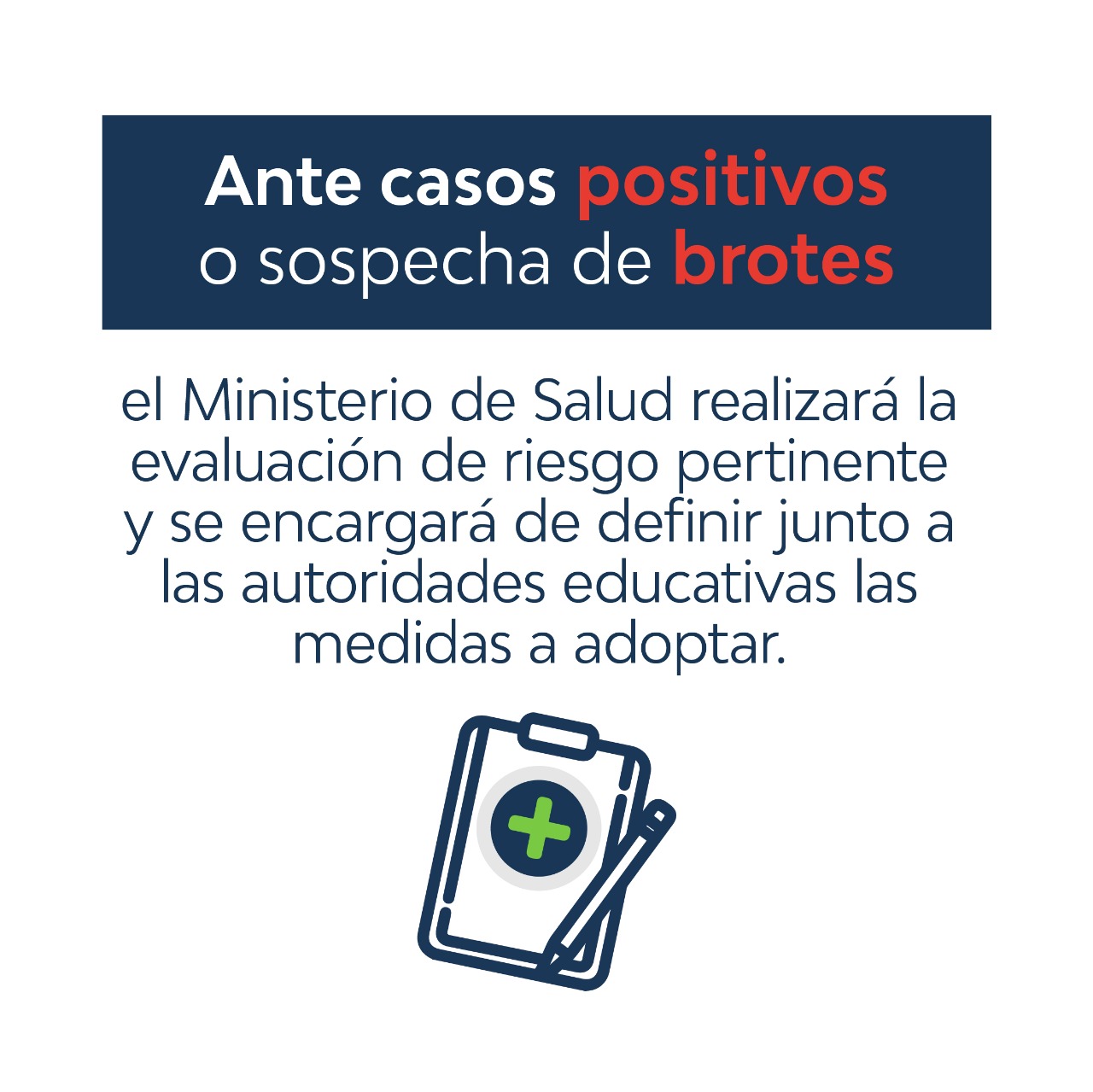 - Frente a sospechas de brotes, el Ministerio de Salud realizará la evaluación de riesgo pertinente y se encargará de definir junto a las autoridades educativas las medidas a adoptar.