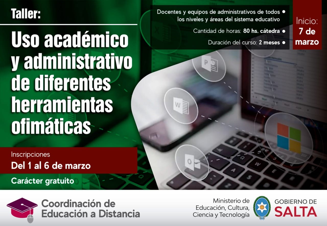 A través de la Coordinación de Educación a Distancia se abren las inscripciones para el taller denominado “Capacitación Uso Académico y Administrativo de diferentes herramientas Ofimáticas” de carácter gratuito con modalidad virtual, este curso está destinado a docentes y equipos de administrativos de todos los niveles y áreas del sistema educativo.