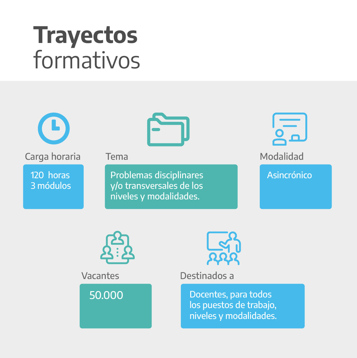 - Trayectos formativos: están conformados por tres módulos vinculados con una temática específica. Ofrecen a las y los docentes materiales teóricos, propuestas de intervención y recursos. Se cursan de forma virtual y la carga horaria total de este recorrido formativo es de 120 horas.