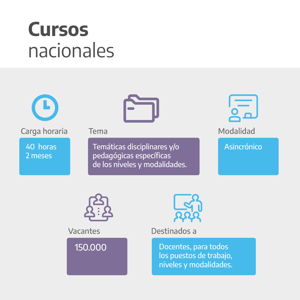 - Cursos nacionales: abordan temáticas disciplinares y/o pedagógicas específicas de los distintos niveles y modalidades de enseñanza. Articulan con distintas áreas del Ministerio de Educación y con otros organismos. Tienen una carga horaria de 40 horas y se cursan de forma virtual a lo largo de dos meses.