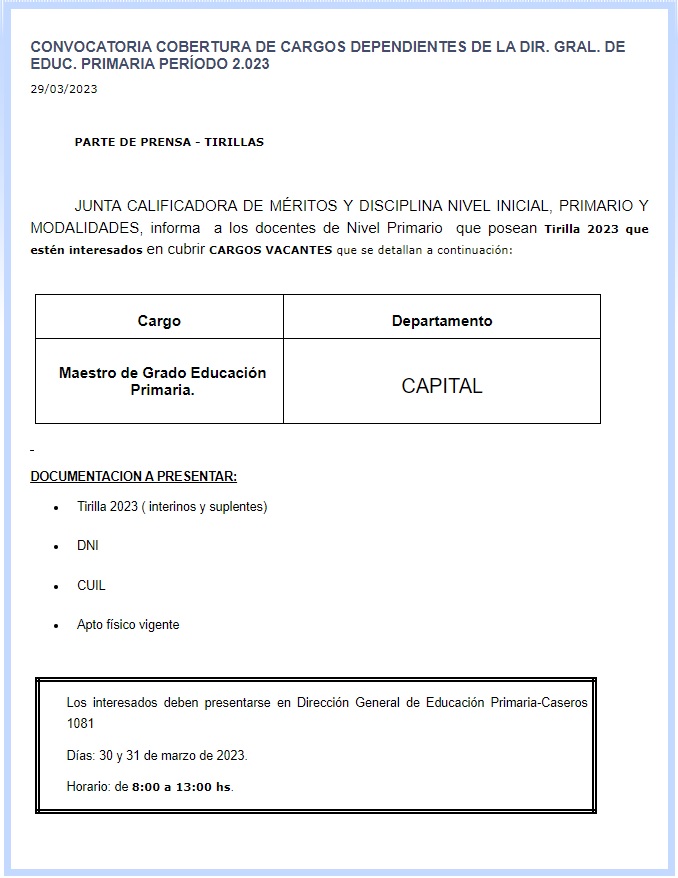 Junta Calificadora de Méritos y Disciplina, Nivel Inicial, Primario y Modalidades, informa a los que estén interesados en cubrir CARGOS VACANTES que se detallan a continuación: