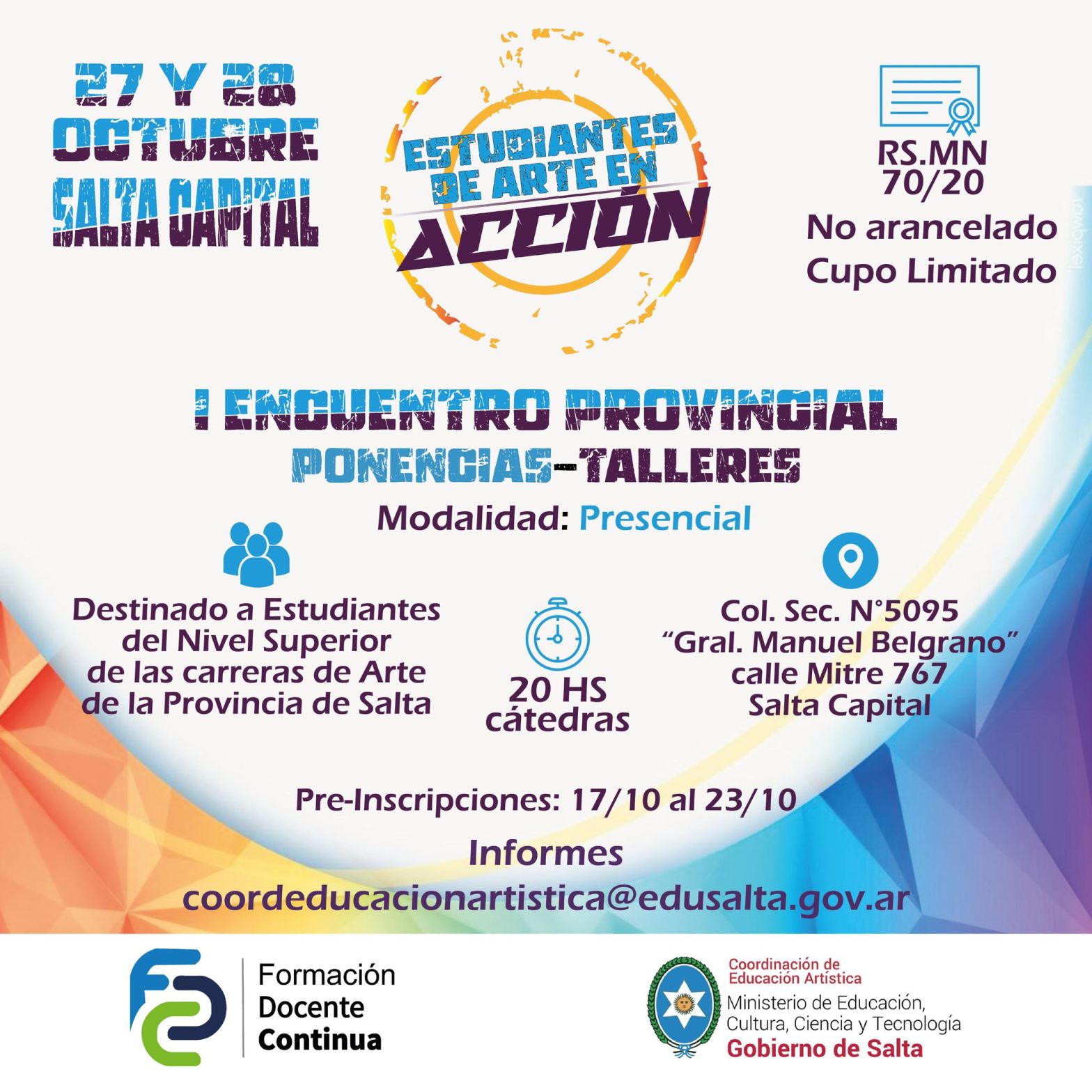 El Ministerio de Educación, Cultura, Ciencia y Tecnología, a través de Coordinación de Educación Artística, propone el I Encuentro Provincial “Estudiantes de Arte en Acción”, que tendrá lugar en las instalaciones del Colegio Secundario N°5095 “Gral. Manuel Belgrano” los días 27 y 28 de octubre.
