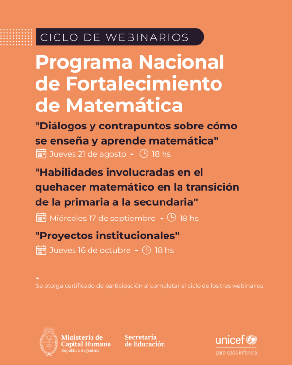 ¿Cómo se enseña y se aprende matemática? ¿Cuáles son las habilidades involucradas en el quehacer matemático durante la transición entre la primaria y el secundario? ¿De qué manera se pueden promover proyectos institucionales centrados en la enseñanza de esta disciplina? Estas son algunas de las cuestiones que se responderán en el ciclo de webinarios organizado desde la Secretaría de Educación del Ministerio de Capital Humano, y que contará con la colaboración de UNICEF.