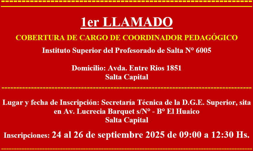 | Coordinador Pedagógico | Instituto Superior del Profesorado de Salta N° 6005 Turnos de funcionamiento: Mañana, Tarde y Noche Régimen Académico: Común Avda. Entre Rios 1851 Salta Capital | Secretaria Técnica de la DGES Avda. Lucrecia Barquet s/N° B° El Huaico Salta Capital 24, 25 y 26 de septiembre de 09:00 a 12:30 Hs | Disp. 257/2025 |