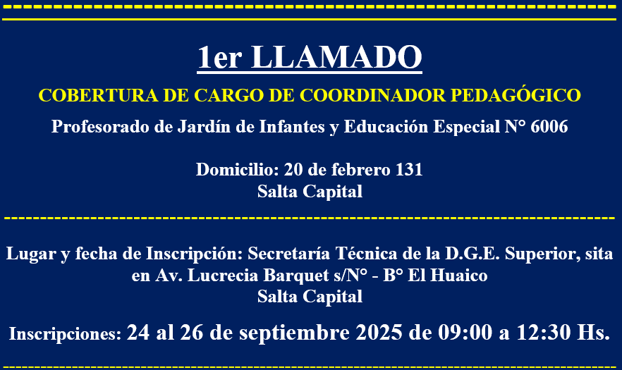 | Coordinador Pedagógico | Profesorado de Jardín de Infantes y Educación Especial N° 6006 Turnos de funcionamiento: Vespertino Régimen Académico: Común 20 de febrero 131 Salta Capital | Secretaria Técnica de la DGES Avda. Lucrecia Barquet s/N° B° El Huaico Salta Capital 24, 25 y 26 de septiembre de 09:00 a 12:30 Hs | Disp. 259/2025 |