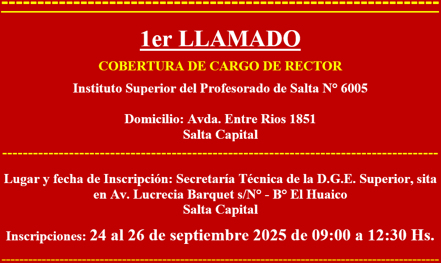 | Rector | Instituto Superior del Profesorado de Salta N° 6005 Turnos de funcionamiento: Mañana, Tarde y Noche Régimen Académico: Común Avda. Entre Ríos 1851 Salta Capital | Secretaria Técnica de la DGES Avda. Lucrecia Barquet s/N° B° El Huaico Salta Capital 24, 25 y 26 de septiembre de 09:00 a 12:30 Hs | Disp. 255/2025 |