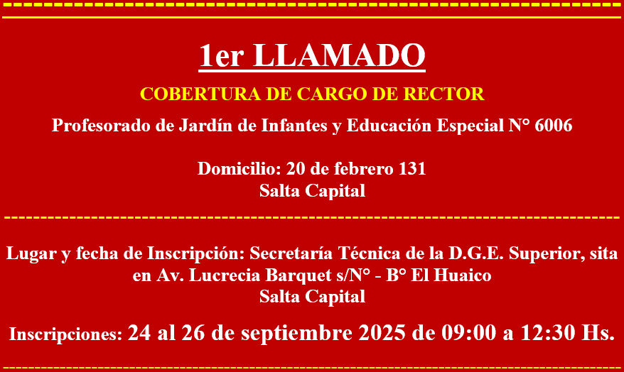 | Rector | Profesorado de Jardín de Infantes y Educación Especial N° 6006 Turnos de funcionamiento: Vespertino Régimen Académico: Común 20 de febrero 131 Salta Capital | Secretaria Técnica de la DGES Avda. Lucrecia Barquet s/N° B° El Huaico Salta Capital 24, 25 y 26 de septiembre de 09:00 a 12:30 Hs | Disp. 258/2025 |