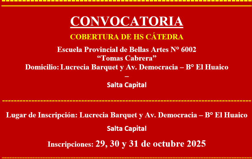 La Escuela Provincial de Bellas Artes N° 6002 “Tomas Cabrera” de Salta Capital, llama a inscripción de interesados para la cobertura de Hs cátedra frente a alumnos en el marco de la Disposición 269/03 y de la Disposición 309/24 de la Dirección General de Educación Superior, que reglamenta la cobertura de dichas horas y según disposición interna de aprobación de la grilla Institucional, según el siguiente detalle: