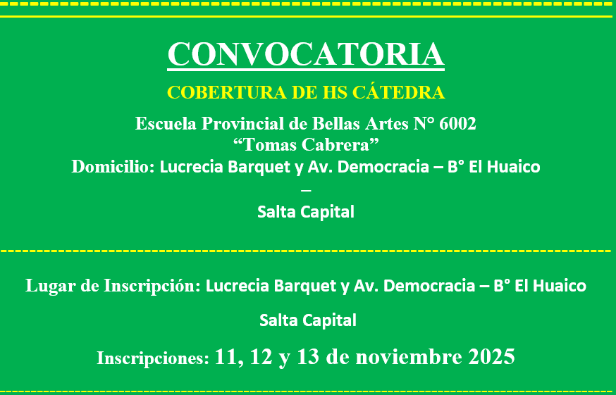 La Escuela Provincial de Bellas Artes N° 6002 “Tomas Cabrera” de Salta Capital, llama a inscripción de interesados para la cobertura de Hs cátedra frente a alumnos en el marco de la Disposición 269/03 y de la Disposición 309/24 de la Dirección General de Educación Superior, que reglamenta la cobertura de dichas horas y según disposición interna de aprobación de la grilla Institucional, según el siguiente detalle: