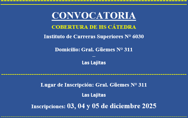 El Instituto de Carreras Superiores N° 6030 de Las Lajitas, llama a inscripción de interesados para la cobertura de Hs cátedra frente a alumnos en el marco de la Disposición 269/03 y de la Disposición 309/24 de la Dirección General de Educación Superior, que reglamenta la cobertura de dichas horas y según disposición interna de aprobación de la grilla Institucional, según el siguiente detalle: