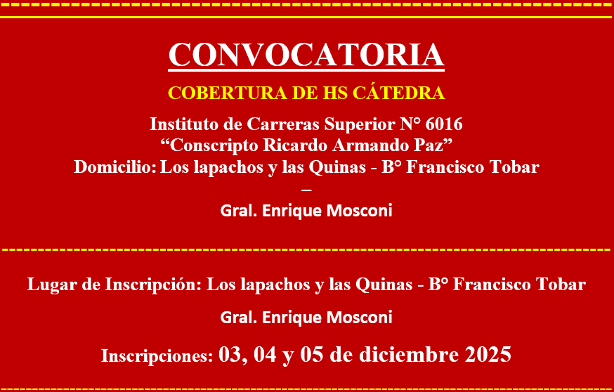 El Instituto de Carreras Superiores N° 6016 “Conscripto Ricardo Armando Paz” de Gral. Enrique Mosconi, llama a inscripción de interesados para la cobertura de Hs cátedra frente a alumnos en el marco de la Disposición 269/03 y de la Disposición 309/24 de la Dirección General de Educación Superior, que reglamenta la cobertura de dichas horas y según disposición interna de aprobación de la grilla Institucional, según el siguiente detalle: