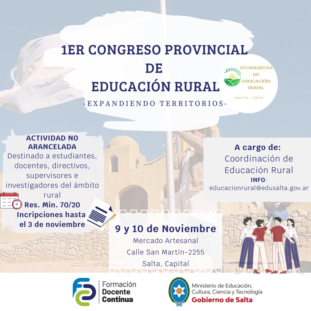 El Ministerio de Educación, Cultura, Ciencia y Tecnología de Salta, a través de la Coordinación de Educación Rural, invita a participar del 1°Congreso Provincial de Educación Rural.