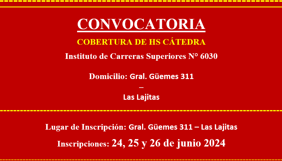 CONVOCATORIA PARA LA COBERTURA DE HS CÁTEDRA IES 6030 DE LAS LAJITAS