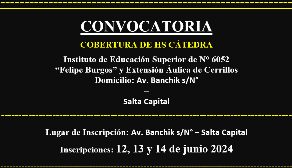 CONVOCATORIA PARA LA COBERTURA DE HS CÁTEDRA IES 6052 DE SALTA CAPITAL Y CERRILLOS