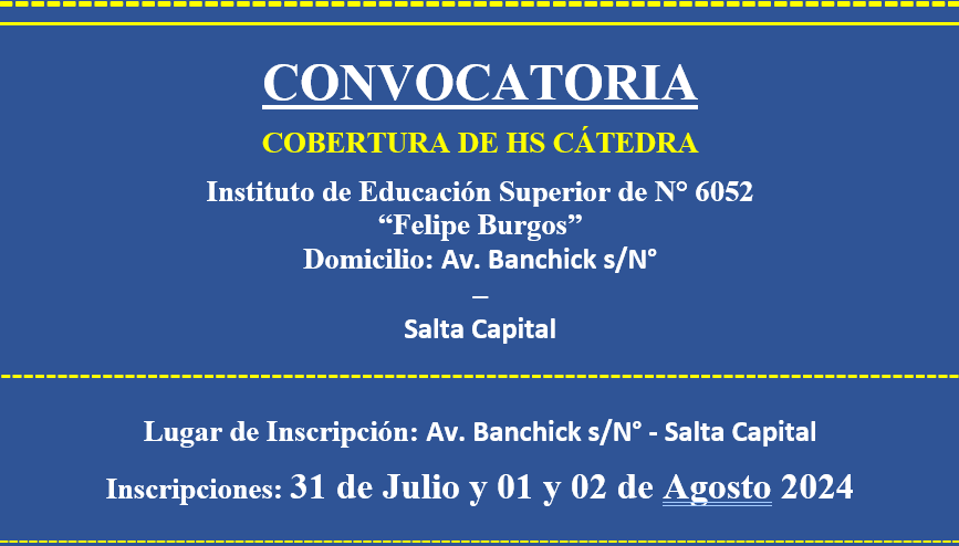 CONVOCATORIA PARA LA COBERTURA DE HS CÁTEDRA IES 6052 DE SALTA CAPITAL