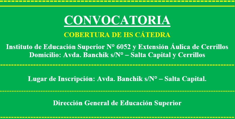 CONVOCATORIA PARA LA COBERTURA DE HS CÁTEDRA IES 6052 Y EXTENSIÓN ÁULICA – Salta Capital y Cerrillos