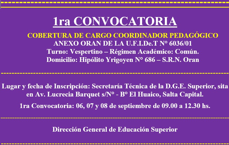 PRIMERA CONVOCATORIA A CONCURSO DE CARGO DE COORDINADOR PEDAGÓGICO PARA EL ANEXO ORAN DE LA U.F.I.De.T. SALTA N° 6036/01 DE SAN RAMÓN DE LA NUEVA ORAN