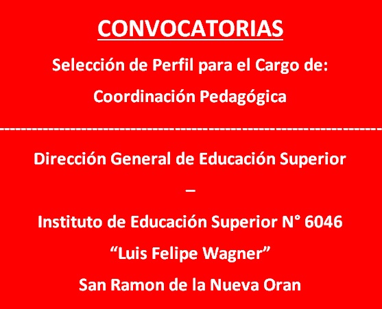 La Dirección General de Educación Superior realiza la segunda convocatoria a concurso para acceso al cargo de Coordinador Pedagógico en el Instituto de Educación Superior N° 6046 “Luis Felipe Wagner” de la ciudad de San Ramón de la Nueva Oran dependiente de esta Dirección General. Se efectuara en el marco de lo establecido en elSigue leyendo «2° CONVOCATORIA CONCURSO DE CARGO DE COORDINACIÓN PEDAGÓGICA IES N° 6046»