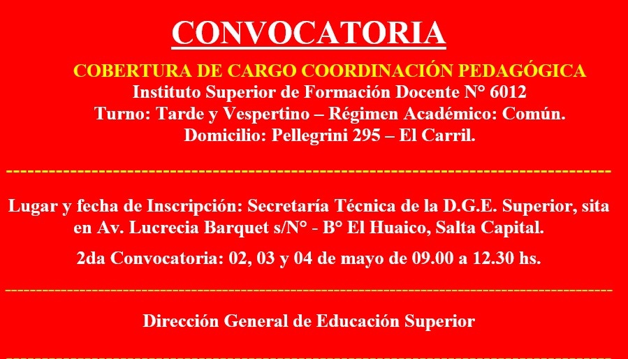 2° CONVOCATORIA CONCURSO DE CARGO DE COORDINACIÓN PEDAGÓGICA IES N° 6046