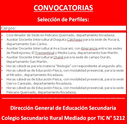CONVOCATORIA PARA LA SELECCIÓN DE PERFILES “COLEGIO SECUNDARIO MEDIADO POR TIC N° 5212”