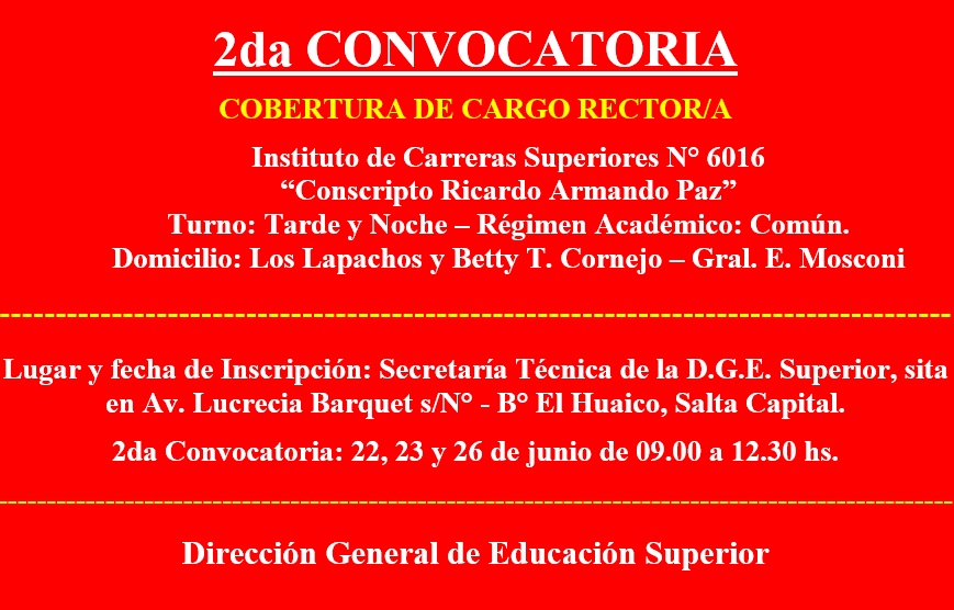 2da CONVOCATORIA A CONCURSO CARGO DE RECTOR/A PARA EL IES N° 6016 DE GRAL. ENRIQUE MOSCONI