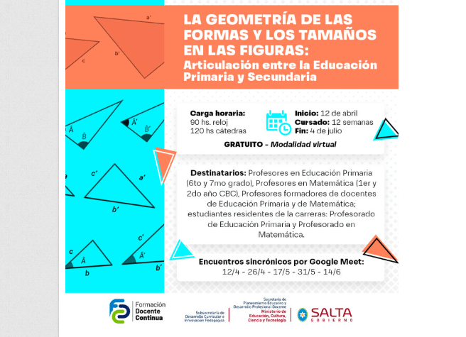 Desde la Dirección General de Desarrollo Profesional Docente y la Dirección de Formación Docente Continua se invita a docentes a participar del curso de capacitación “La geometría de las formas y los tamaños en las figuras: articulación entre Educación Primaria y Secundaria”. La capacitación es gratuita y está destinada a: Presenta modalidad virtual mediante encuentrosSigue leyendo «CURSO DE CAPACITACIÓN “LA GEOMETRÍA DE LAS FORMAS Y LOS TAMAÑOS EN LAS FIGURAS: ARTICULACIÓN ENTRE EDUCACIÓN PRIMARIA Y SECUNDARIA”»