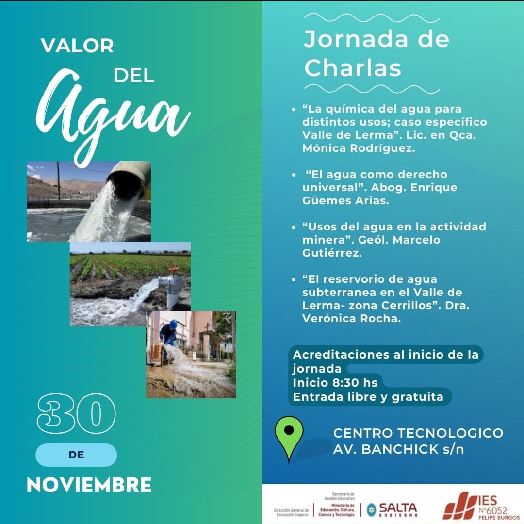 La Capacitación en «El Valor del Agua» se realizará este sábado 30 de noviembre en el Centro Tecnológico sito, Av. Banchick s/N°, Salta capital. Con el propósito de fomentar la conciencia sobre la importancia del agua como recurso esencial, este sábado 30 de noviembre a las 8:30 hs. se llevará a cabo una capacitación tituladaSigue leyendo «JORNADA DE CHARLAS: VALOR DEL AGUA»