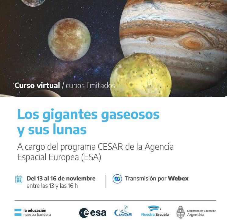 Curso «Los Gigantes Gaseosos y sus lunas» Organizado por el equipo CESAR de la Agencia Espacial Europea, ESA. Ya está abierta la inscripción para el curso virtual “Los gigantes gaseosos y sus lunas”, dirigido a docentes de ciencias de nivel primario, secundario y superior. La capacitación será del 13 al 16 de noviembre, entre lasSigue leyendo «CURSO LOS GIGANTES GASEOSOS Y SUS LUNAS»
