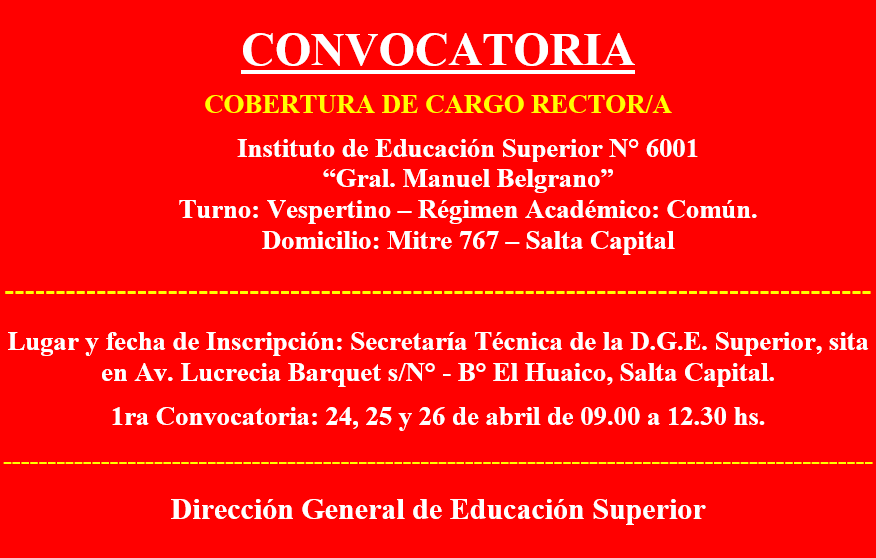PRIMERA CONVOCATORIA A CONCURSO DE CARGOS DE RECTOR/A INSTITUTO DE EDUCACIÓN SUPERIOR N° 6001