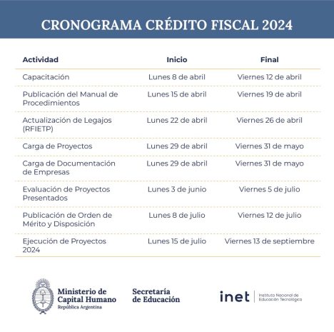 El Crédito Fiscal es un instrumento diseñado para financiar proyectos de capacitación en recursos humanos y adquisición de equipamiento para establecimientos educativos, a través de iniciativas que conecten la educación con el mundo laboral. Objetivos de los Proyectos Los proyectos enmarcados en la Convocatoria Crédito Fiscal 2024 abarcan diversas acciones con el propósito de: HorarioSigue leyendo «CONVOCATORIA CRÉDITO FISCAL 2024»