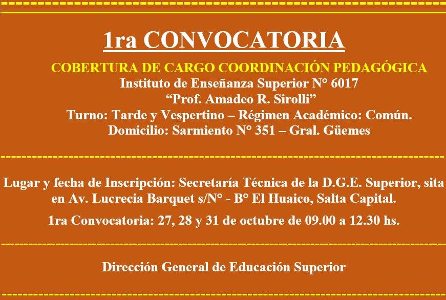 PRIMERA CONVOCATORIA A CONCURSO DE CARGO DE COORDINADOR PEDAGÓGICO PARA EL INSTITUTO DE ENSEÑANZA SUPERIOR N° 6017 “PROF. AMADEO R. SIROLLI” DE GRAL GÜEMES
