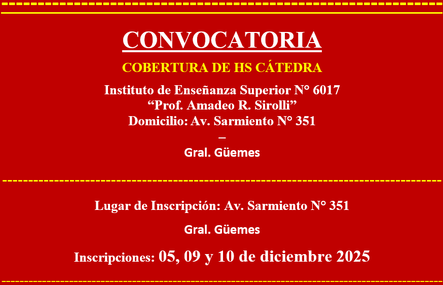 CONVOCATORIA PARA LA COBERTURA DE HS CÁTEDRA IES 6017 DE GRAL. GÜEMES