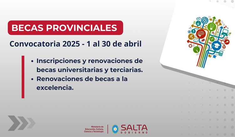 El Ministerio de Educación, Cultura, Ciencia y Tecnología de la Provincia de Salta, a través de la Subsecretaría de Políticas Socioeducativas, pone en marcha del 1 al 30 de abril la convocatoria de Becas Nivel Superior: Los interesados podrán consultar el reglamento, conocer los requisitos e inscribirse en: https://sga.edusalta.gov.ar/BecasProvinciales/inicio/Index.aspx Las becas provinciales están destinadas aSigue leyendo «BECAS UNIVERSITARIAS Y TERCIARIAS DE LA PROVINCIA DE SALTA – CONVOCATORIA 2025»