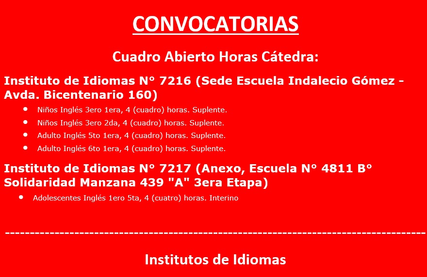 CONVOCATORIA DE CUADRO ABIERTO PARA COBERTURA DE HORAS CATEDRAS DE INSTITUTO DE IDIOMAS N 7216 (SEDE) Y 7217 (ANEXO)