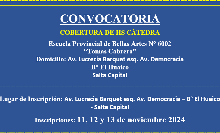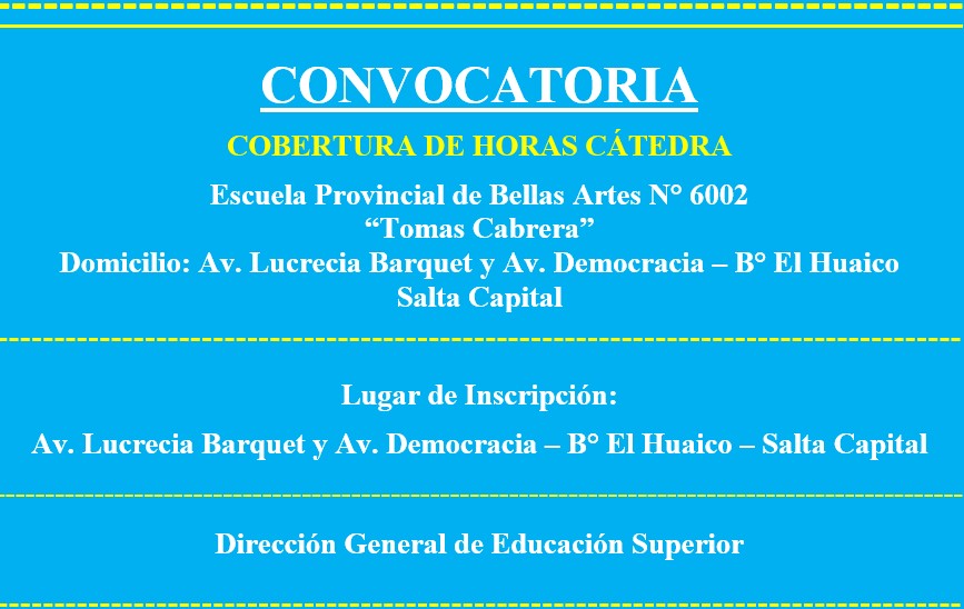 La Escuela Provincial de Bellas Artes N° 6002 “Tomas Cabrera” de Salta Capital, llama a inscripción de interesados para la cobertura de Hs cátedra frente a alumnos en el marco de la Disposición 269/03 de la Dirección General de Educación Superior, que reglamenta la cobertura de dichas horas y según disposición interna de aprobación de la grilla Institucional,Sigue leyendo «CONVOCATORIA PARA LA COBERTURA DE HS CÁTEDRA IES 6002 DE SALTA»