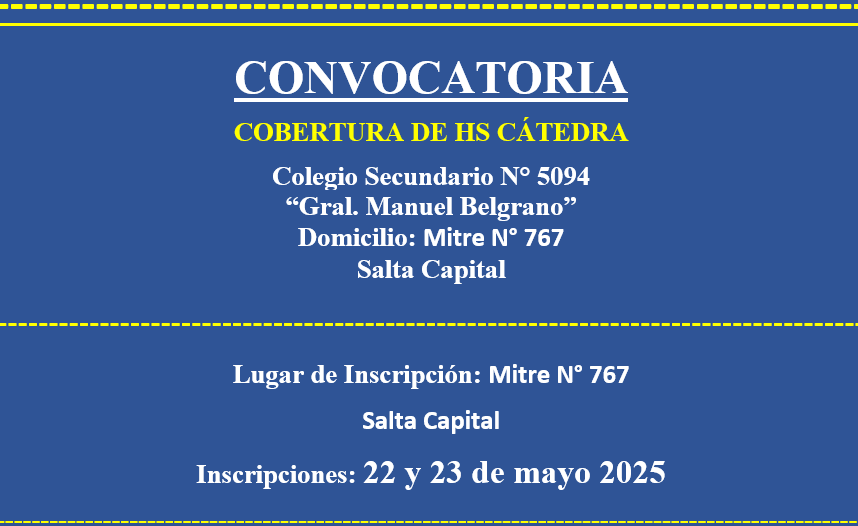 CONVOCATORIA PARA LA COBERTURA DE HS CÁTEDRA COLEGIO SECUNDARIO N° 5094 “GRAL. MANUEL BELGRANO” SALTA CAPITAL