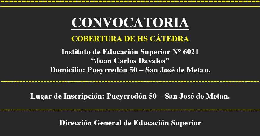 CONVOCATORIA PARA LA COBERTURA DE HS CÁTEDRA IES 6021 SAN JOSÉ DE METAN