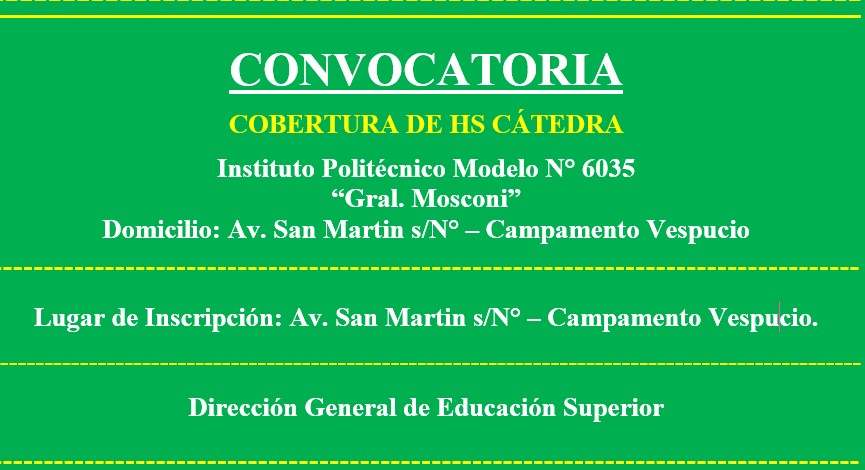 CONVOCATORIA PARA LA COBERTURA DE HS CÁTEDRA IES 6035 CAMPAMENTO VESPUCIO