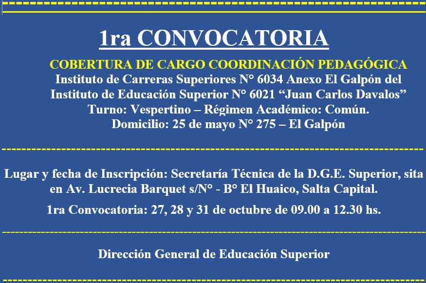PRIMERA CONVOCATORIA A CONCURSO DE CARGO DE COORDINADOR PEDAGÓGICO PARA EL INSTITUTO DE CARRERAS SUPERIORES N° 6034 ANEXO EL GALPÓN DEL INSTITUTO DE EDUCACIÓN SUPERIOR N° 6021