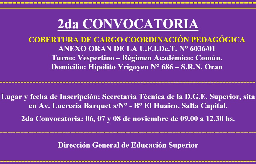 SEGUNDA CONVOCATORIA A CONCURSO DE CARGO DE COORDINADOR PEDAGÓGICO PARA EL ANEXO ORAN DE LA UFIDET N° 6036/01 DE S.R.N. ORAN