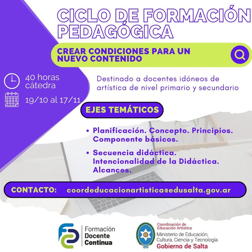 El Ministerio de Educación, Cultura, Ciencia y Tecnología, a través de la Coordinación de Educación Artística, propone una capacitación para docentes Idóneos activos de Educación Artística, atendiendo a las diversas necesidades que demanda el Nivel Primario y Secundario. El presente ciclo de formación pedagógico tiene como principal fundamento brindar las herramientas teóricas y metodológicas aplicadasSigue leyendo «CICLO DE FORMACIÓN PEDAGÓGICA PARA DOCENTES IDÓNEOS DE ARTÍSTICA»