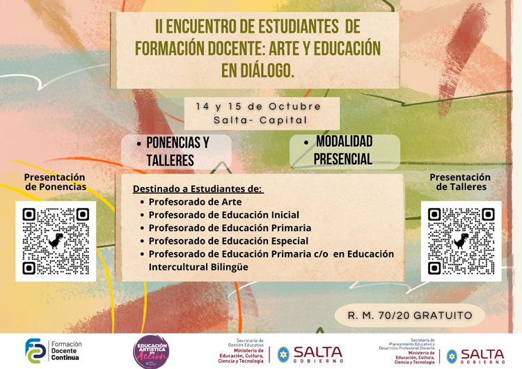 El Ministerio de Educación, Cultura, Ciencia y Tecnología, a través de Coordinación de Educación Artística, informa la realización del II Encuentro de Estudiantes de Formación Docente: Arte y Educación en Diálogo, que se llevará a cabo los días 14 y 15 de octubre de 2025 en la Casa de la Cultura, ubicada en Caseros 460, enSigue leyendo «II ENCUENTRO DE ESTUDIANTES DE FORMACIÓN DOCENTE»