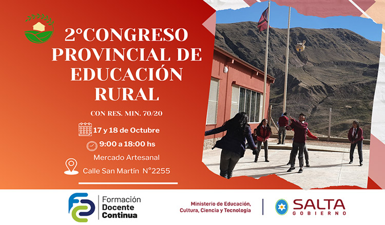 El Ministerio de Educación, Cultura, Ciencia y Tecnología de Salta, a través de la Coordinación de Educación Rural, invita a toda la comunidad educativa en general a participar en el 3° Congreso Provincial de Educación Rural “Territorios que dialogan, comunidades que transforman”. El evento se desarrollará los días 19 y 20 de noviembre en las instalaciones delSigue leyendo «3° CONGRESO PROVINCIAL DE EDUCACIÓN RURAL “TERRITORIOS QUE DIALOGAN, COMUNIDADES QUE TRANSFORMAN”»