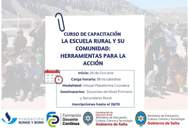 El Ministerio de Educación, Cultura, Ciencia y Tecnología de Salta, a través de la Coordinación de Educación Rural y en articulación con el equipo de la Fundación Bunge Born-Fundación Pérez Companc – Programa Sembrador, invitan a participar del curso de capacitación docente denominado “Prácticas de enseñanza, aprendizaje y evaluación en escuelas de contextos rurales». El cual,Sigue leyendo «INSCRIPCIONES AL CURSO: PRÁCTICAS DE ENSEÑANZA, APRENDIZAJE Y EVALUACIÓN EN ESCUELAS DE CONTEXTOS RURALES»