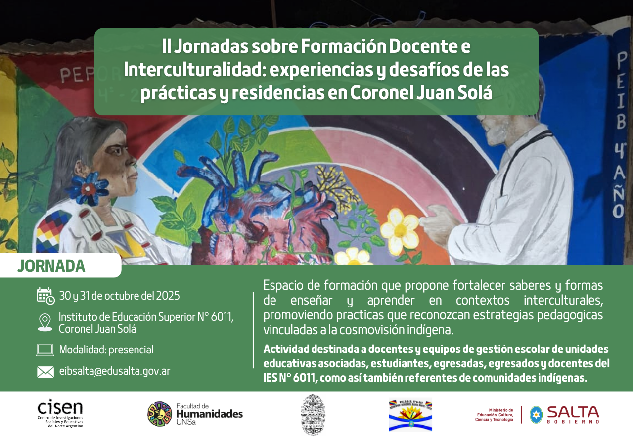 En el Instituto de Educación Superior N° 6011 de Coronel Juan Solá, se realizan las II Jornadas sobre Formación Docente e Interculturalidad: experiencias y desafíos de las prácticas y residencias, los días 30 y 31 de octubre. Se invita a participar a estudiantes, egresadas y egresados, docentes del Instituto, equipos de gestión de unidades educativasSigue leyendo «II JORNADAS SOBRE FORMACIÓN DOCENTE E INTERCULTURALIDAD EN CNEL. JUAN SOLÁ»