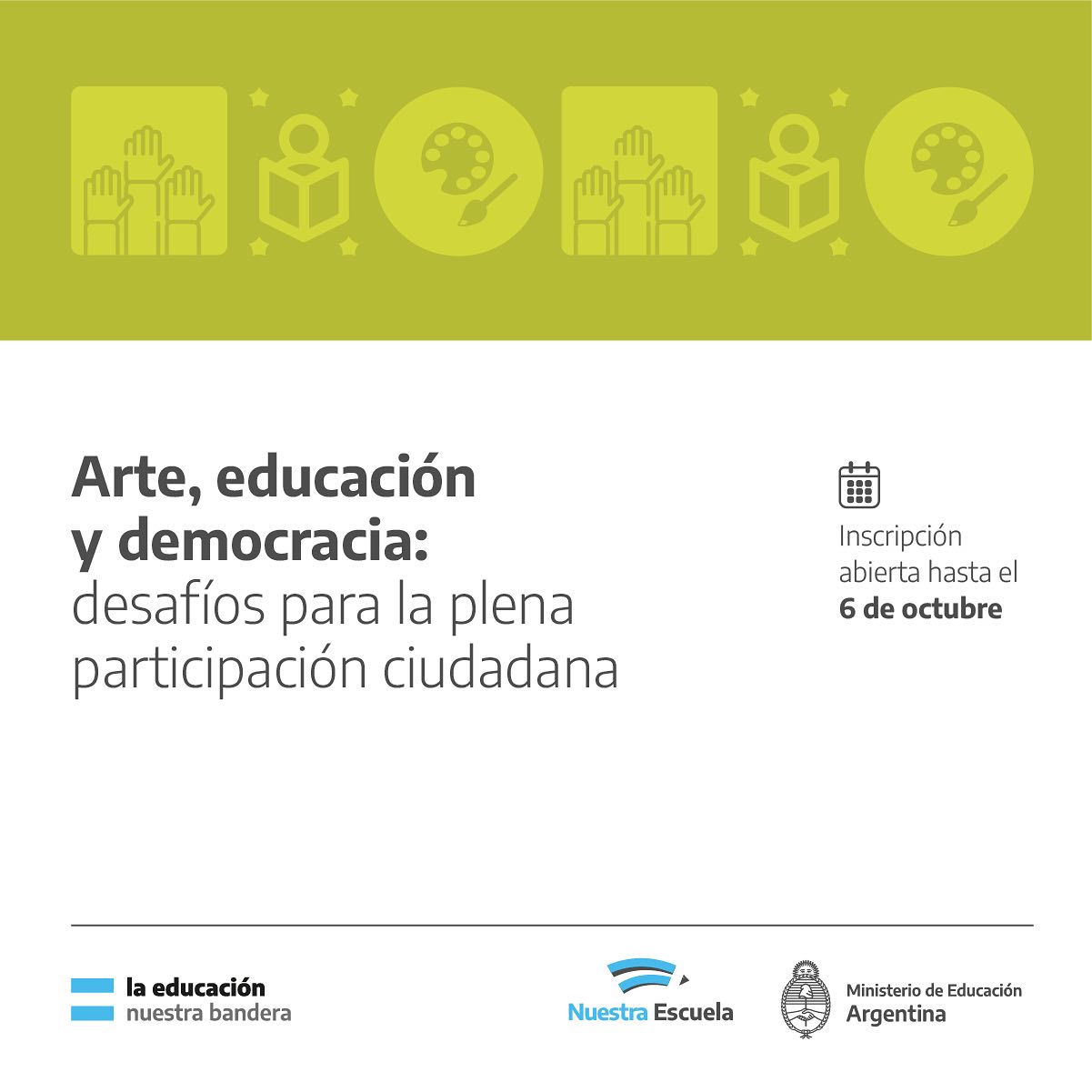 Curso para estudiantes de Formación Docente ¡Inscripciones abiertas de cursos para estudiantes de formación docente! Podés inscribirte hasta el 6 de octubre. ¿Cómo es la cursada? Virtual Duración: 5 semanas Carga horaria total: 25 hs La cursada contará con tres encuentros virtuales sincrónicos y clases asincrónicas. La propuesta es gratuita y se inscribe en elSigue leyendo «ARTE, EDUCACIÓN Y DEMOCRACIA: DESAFIOS PARA LA PLENA PARTICIPACIÓN CIUDADANA»