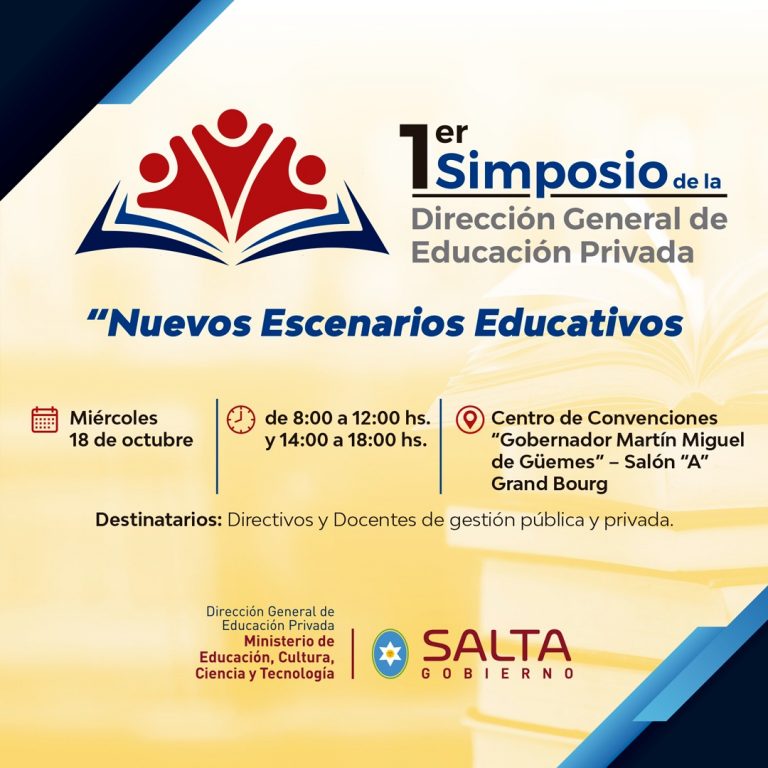 La propuesta se denomina: “Nuevos Escenarios” y está planificada para realizarse el día miércoles 18 de octubre en el Centro de Convenciones “Gobernador Martín Miguel de Güemes“ Salón “A“ Grand Bourg, de 8:00 a 12:00 y 14:00 a 18:00 horas y estará dirigida a directivos y docentes de Gestión Pública y Privada. Se organizó elSigue leyendo «1° SIMPOSIO DE LA DIRECCIÓN GENERAL DE EDUCACIÓN PRIVADA»