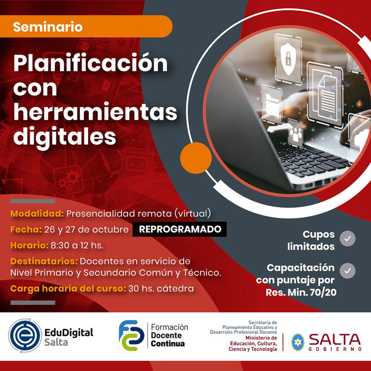 El Equipo de Educación Digital, dependiente de la Subsecretaría de Desarrollo Curricular en Innovación Pedagógica, propone a docentes en servicio de Nivel Primario, Secundario Común y Técnico, participar del Seminario de “Planificación con herramientas digitales”. Cuya fecha de inicio es el 26 de octubre para el Nivel Primario y el 27 de octubre para elSigue leyendo «SEMINARIO DE PLANIFICACIÓN CON HERRAMIENTAS DIGITALES»