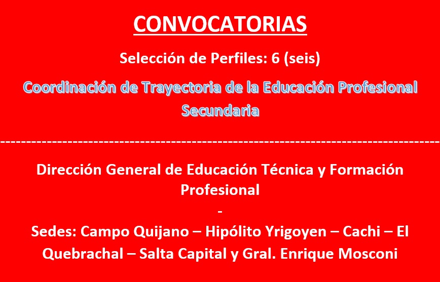 Convocatoria para la Cobertura de Perfiles de 6 Coordinadores de Trayectoria de la Educación Profesional Secundaria con una carga horaria de 20 hs. reloj semanal. Educación Profesional Secundaria es una oferta educativa propia de la Modalidad Técnico Profesional y se encuentra enmarcada en la Resolución del CFE N° 409/21. Su diseño integra la Formación ProfesionalSigue leyendo «CONVOCATORIA COORDINADORES DE TRAYECTORIA DE EDUCACIÓN PROFESIONAL SECUNDARIA»